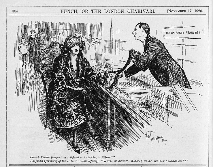 7. Фредерик Таунсенд. Британский продавец предлагает покупательнице-француженке чулки из «так называемого» шелка. Журнал Punch. 1920. Изображение любезно предоставлено Публичной библиотекой Торонто