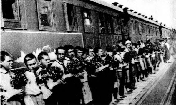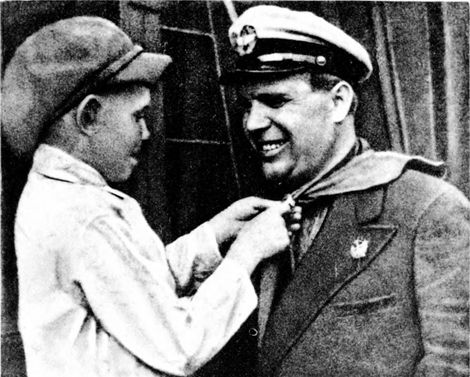 Пятилетняя девочка дарит цветы матросу «Челюскина».