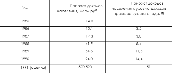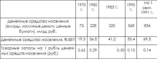 Беспрецедентными для российской денежной истории (после гиперинфляции 1921–1922 гг.) темпами растут масштабы денежной эмиссии. «За 9 месяцев т.г. выпуск денег в обращение составил 70,3 млрд. рублей, что превышает размер эмиссии за предшествующие 5 лет (65.6 млрд. рублей)».[587] «Прирост сбережений населения в организованных формах (вклады, ценные бумаги) за восемь месяцев т. г., составил 58 млрд. рублей и увеличился против января-августа 1990 г. на 31,8 млрд, рублей или в 2,2 раза. Накопление средств у населения в определенной мере является вынужденным, так как заработанные деньги граждане не могут реализовать из-за недостатка товаров и услуг на внутреннем рынке. Если не принять срочных мер по увеличению производства товаров народного потребления и объема платных услуг, а также по ограничению неоправданного использования предприятиями средств на оплату труда, остатки денежных средств населения в 1991 году могут увеличиться на 250–280 млрд. рублей, в т. ч. в наличных деньгах на 100–110 млрд. рублей. Количество денег в обращении может возрасти с 136 млрд. рублей на 1 января 1991 года до 240–250 млрд. рублей на конец 1991 года. […] Госбанк СССР не видит возможности для дальнейшего прямого кредитования дефицита государственного бюджета за счет краткосрочных кредитных ресурсов, т. е. эмиссии наличных денег. Уже сейчас около 60% этих ресурсов использовано на покрытие расходов бюджетного характера и продолжение такой практики чревато крайне отрицательными последствиями для экономики».