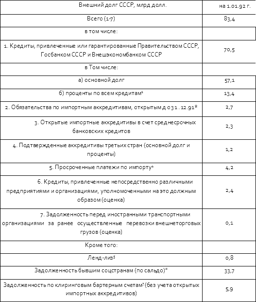 Примечание. Таким образом, долговые обязательства, не входившие в состав официального советского внешнего долга в конвертируемой валюте, но включаемые руководством Внешэкономбанка в состав долговых обязательств страны составили 40,4 млрд долл., а совокупный советский внешний долг тот же орган оценивал в 23,8 млрд долл.