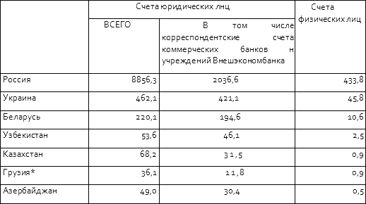 6) Данные приводятся только по сальдо текущих расчетов в переводных рублях и по клирингу (данные предварительные и подлежат уточнению по суммам и курсу пересчета в ходе переговоров с бывшими социалистическими странами). Примерный курс: 1 переводной рубль – 1,795 долл. США)