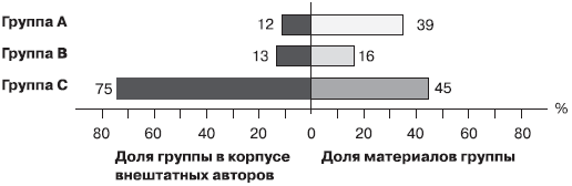 • Группа А: 3 – 20 публикаций за три месяца, 12 % авторов, дающих 39 % всех материалов внештатных авторов;