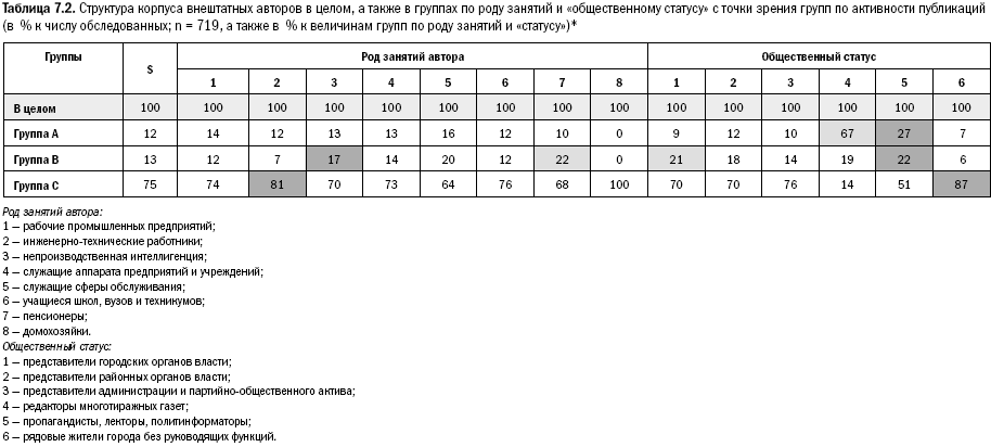 Рассмотрение связей групп по степени активности в создании текста массовой информации с группами по роду занятий и «общественному статусу» позволяет сделать несколько надежных и статистически значимых выводов о стратегии коллектива редакции при создании текста газеты.