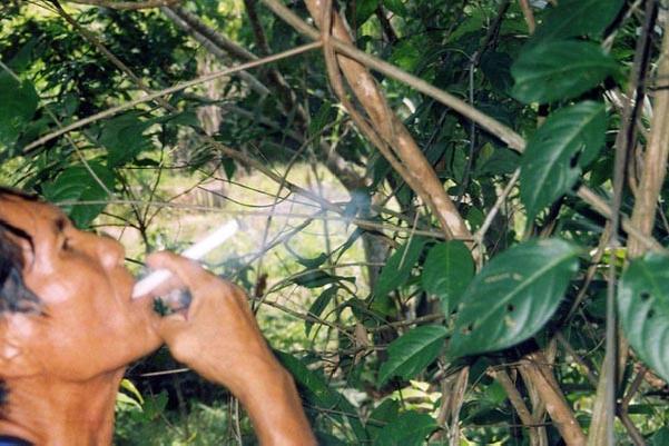 Мы приплыли, выбрались на берег и отправились вслед за доном Робером. Пройдя немного, оказались около хижины. Нас встретил местный индеец со своим псом. Это был друг дона Робера, дон Игнасио, тоже, как оказалось, аяхуаскеро. Они поговорили и, как мне показалось, потерли воздух, после чего мы втроем продолжили путь. В какой-то момент случилось так, что ни впереди, ни сзади я никого не увидел. Я подумал, что сбился с пути и затерялся в диких джунглях, стал суетиться, бегать взад-вперед и звать дона Робера. Он показался среди деревьев и, улыбаясь, помахал мне рукой. Мы собрали нужные листья и возвратились назад к нашим лодкам. Неожиданно начался проливной дождь. Дожди в джунглях теплые, но льют, как говорится, как из ведра. Дон Игнасио, шедший впереди, легко срубил своим мачете огромный лист какого-то росшего по пути кустарника и укрылся таким образом от дождя. Я продолжал идти сзади, любуясь его «зонтом».