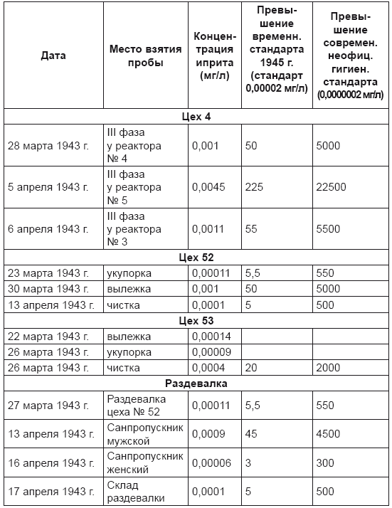 Как уже упоминалось, по решению ГОКО СССР от 6 марта 1943 г. заводу № 102 было приказано произвести в марте невозможное — 420 т иприта и 100 т люизита [425]. Данные комиссии указывают [560], что даже в ее присутствии трудовая вахта по созданию иприта (цех № 4) и наполнению им боеприпасов (отделения цеха № 5, то есть № 52, № 53 и т. д.) совершалась со всеми мыслимыми и немыслимыми нарушениями (плохая герметизация аппаратуры, постоянные разливы иприта на пол, долив иприта и люизита в снаряды и бомбы «с помощью кружек и чайников», течь СОВ из боеприпасов, передача резиновых сапог из смены в смену без дегазации, отсутствие портянок и импрегнированного белья, нерегулярная работа душа, неудовлетворительная работа вытяжной вентиляции, использование на работах с СОВ неполноценных по здоровью работников, отсутствие расследования смертельных случаев профотравлений, неполная выдача спецпитания работникам, необеспечение больных этим спецпитанием). Среди прочего, в том акте было указано о 76 учтенных в медсанчасти завода (в отделе техники безопасности завода цифры были совсем другие) случаях острого отравления людей в течение I квартала 1943 г. Говорилось о переводе за тот период 17 отравленных в профинвалиды. Упоминалось и о восьми случаях смерти в течение все того же I квартала 1943 г. — трех рабочих в цехе № 4 (изготовление иприта) и пяти рабочих в цехе № 5 (разлив иприта, люизита и их смесей по химбоеприпасам). Назовем фамилии тех восьми погибших людей (больше это сделать некому): Лекарев Н. (20 лет), Кускова А. (21 год), Хусудинов З., Каштанова (30 лет), Окаев А. (77 лет), Шашков (52 года), Савельев, Жихарев [560].