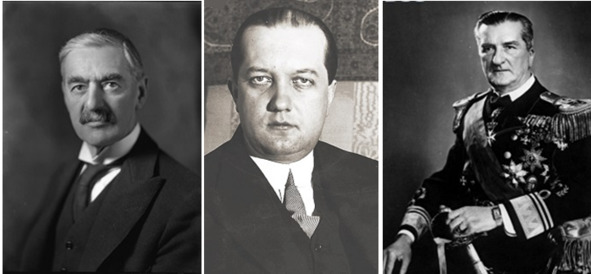 1. Н. Чемберлен премьер-министр Великобритании в 1937—1940 гг. 2. Ю. Липский посол Польши в Германии в 1934—1939 гг. 3. М. Хорти правитель Венгерского королевства в 1920—1944 гг.
