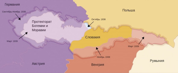 После занятия Судетов, под давлением Германии чехословацкое правительство 7 октября 1938 г. признало автономию Словакии, а 8 октября было вынесено решение о предоставлении автономии Закарпатской Украине (фактически была подготовлена основа для разделения Чехословакии на части).