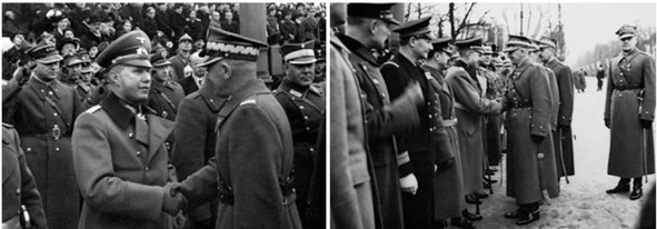 1. Рукопожатие польского маршала Э. Рыдз-Смиглы и немецкого атташе полковника Б. фон Штудница на параде в Варшаве 11 ноября 1938 г. 2. Польские и немецкие военные в 1938 г.