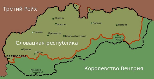 Территория словацкого государства в 1939—1945 гг. (граница обозначена оранжевой линией). 1. Территория Спиш оккупированная Польшей в октябре 1938 г. 2. Территория Орава захваченная Польшей в 1920 г. После разгрома Польши в 1939 г. переданы Словакии.
