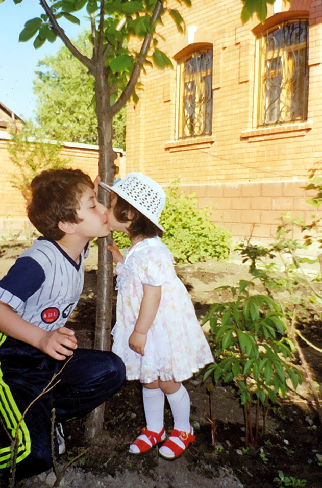 Костя и Диана у недавно посаженного дерева черешни во дворе дома Калоевых. Весна 2001 года