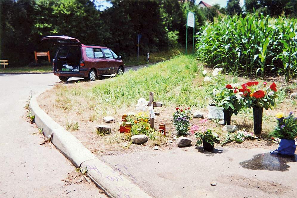 Место падения Кости Калоева. Июль 2002 года. В первые дни после катастрофы местные жители приносили цветы, свечи и игрушки к тем местам, где находили тела детей
