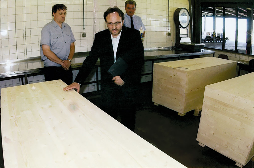 Священник Клаудио Джимаски (на переднем плане), пастор Вальтер Майер (справа) и Микаэль Освальд (слева) на импровизированной службе перед погрузкой гробов с телами Светланы, Кости и Дианы на борт рейса Цюрих – Москва