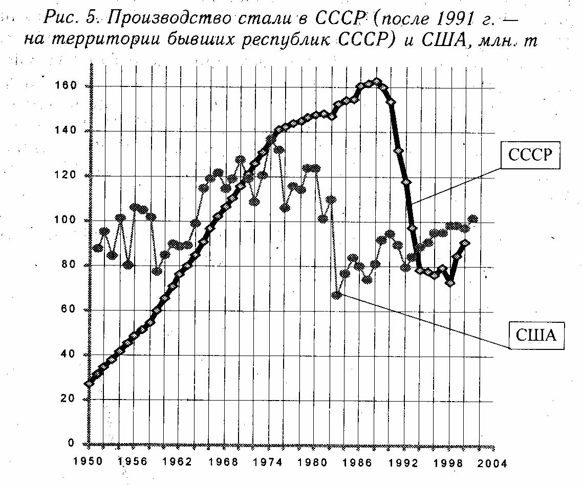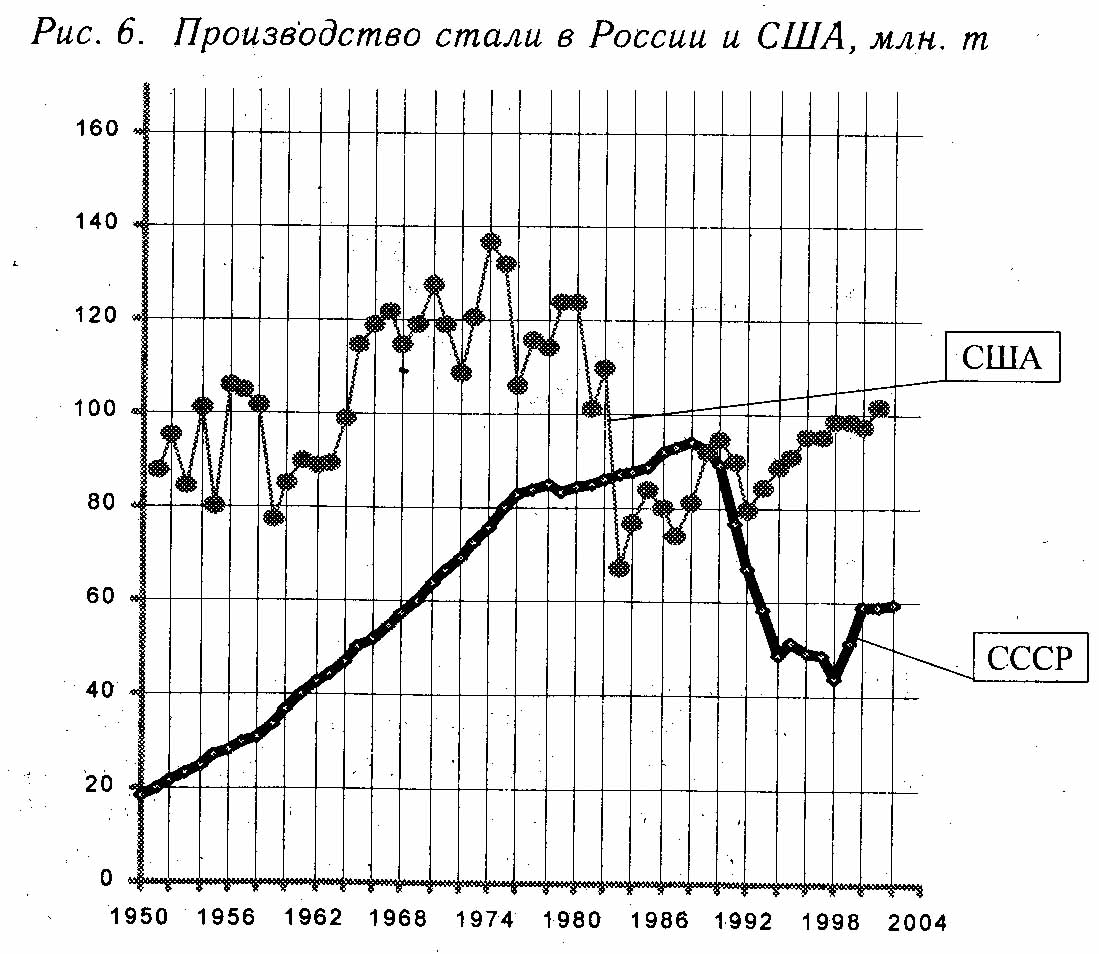 Динамика производства стали в СССР и США приведена на рис. 5 (начиная с 1991 г. показано суммарное производство стали в бывших республиках СССР), а в РСФСР (и РФ) и США — на рис. 6.