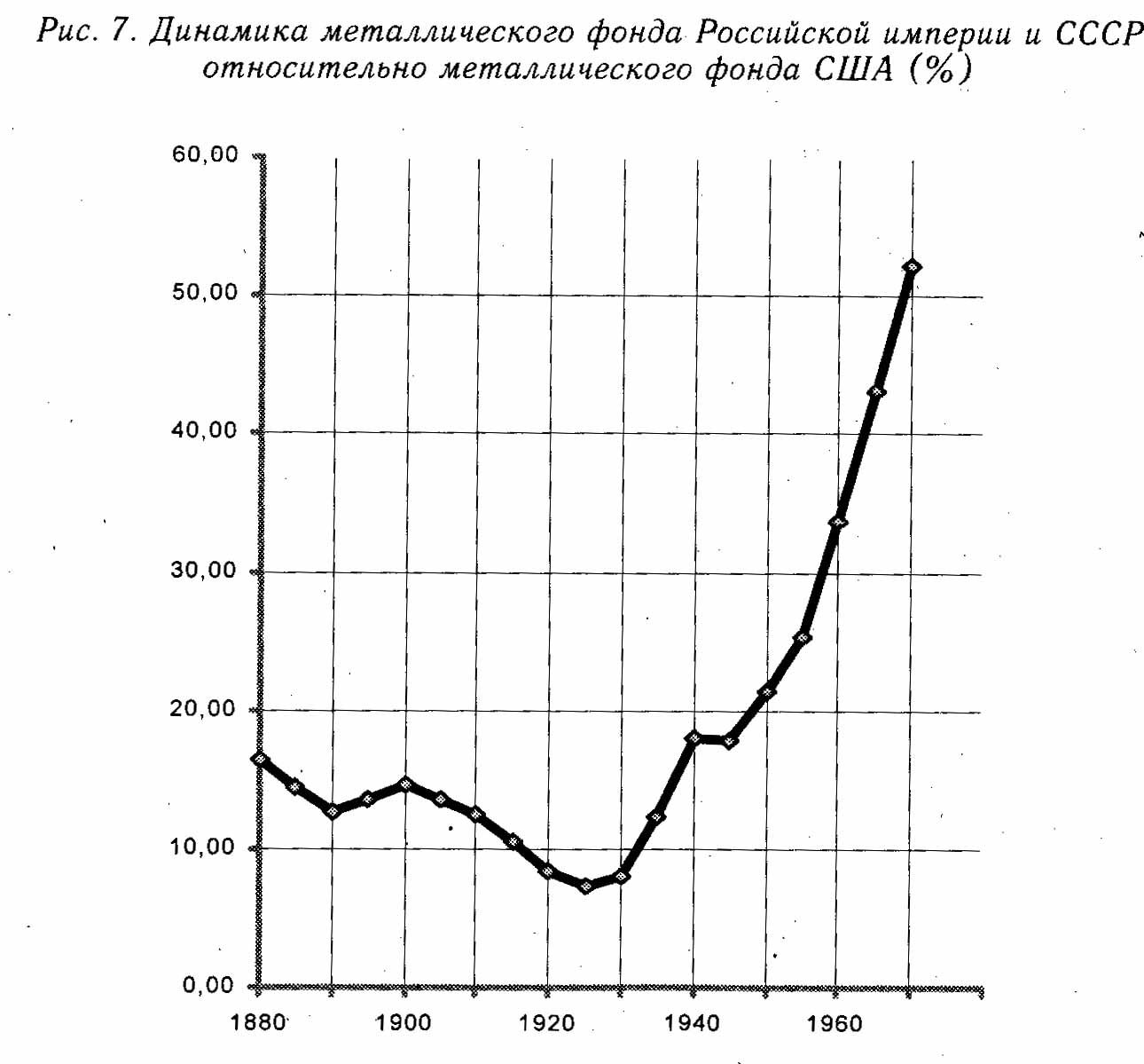 Но и в 1975 г. разрыв все еще был велик. Советское хозяйство стало его преодолевать в 1970-1980 гг. — плановые задания предполагали, что к 1980 г. СССР приблизится к размерам того металлического фонда, которым США располагал в 1970 г. К 1990 г. разрыв можно было сократить еще больше, но этот процесс удалось сорвать пришедшей к власти клике «западников» — под аплодисменты либеральной интеллигенции.
