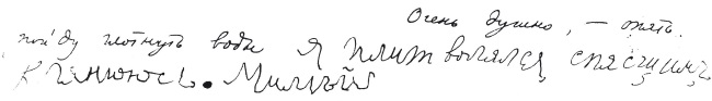 В девять вернулся восвояси и вот пишу к тебе, мой жар-звереныш. Жду, жду, жду тебя. Нет сил больше удерживать тебя в Св. Блазии. Счастие мой, жизнь моя… Очень душно, – опять пойду глотнуть воды Я ПЛИТВОЛЯЛСЯ СПЯСЩИМ КЛЯНЮЮСЬ. МИЛЕЙ – ах какой невыносимый: опять воспользовался. Душа моя, покойной ночи. Люблю очень. В.