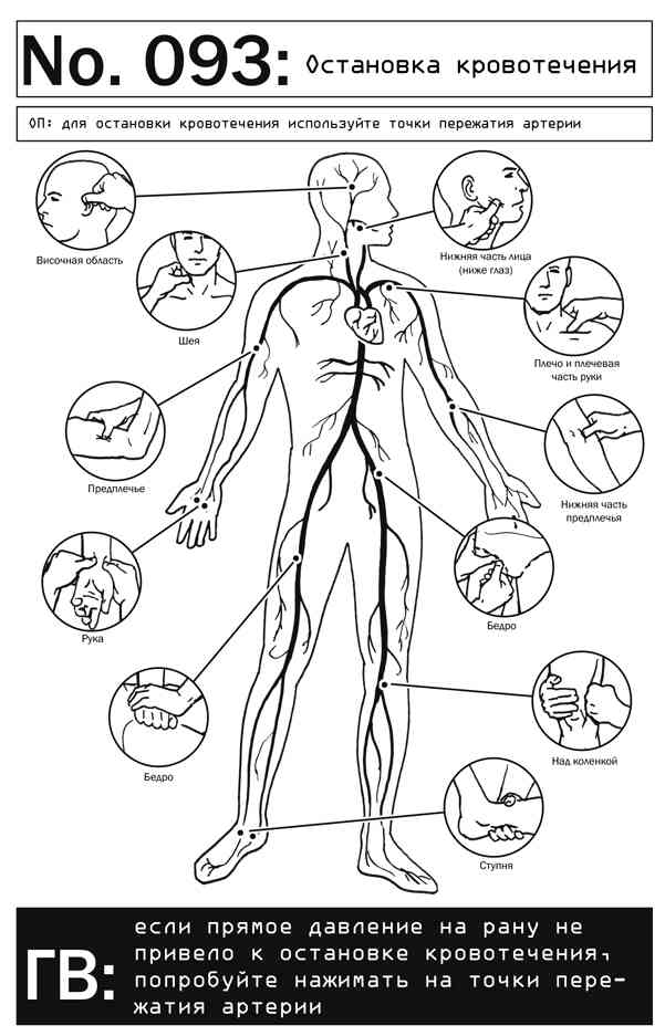 Если вы не можете остановить потерю крови при помощи прямого давления, попробуйте применить такое же усилие к одной из точек пережатия артерии (см. рис.). Выберите точку, расположенную чуть выше места повреждения. если вы не видите места с резким замедлением потока крови, попробуйте надавливать на точки, которые располагаются недалеко от поврежденного сосуда. Если такая точка находится на участке тела с большой мышечной массой или если у потерпевшего избыточный вес, для давления на нее используйте ладонь или тыльную сторону руки.