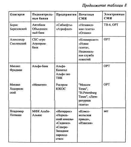 Небольшая группа бизнес-элиты, которая контролировала до 80 % российских финансов, до 1995 г. почти не интересовалась инвестициями в реальный сектор экономики. Но теперь представилась возможность выгодно вложить свои деньги, а заодно и упрочить свое положение как в экономике, так и в политике. Уполномоченные банкиры в начале 90-х гг. из группы виртуально влиятельной превратились в группу действительно влиятельную. Теперь ее политический вес определялся не только связями в коридорах власти, популярностью в СМИ, но и экономическими ресурсами. Стратегический центр бизнес-сообщества постепенно стал перемешаться от банков к другим рыночным институтам (предприятиям промышленности, транспорта, связи, строительства, телекоммуникаций, средствам массовой информации). Этот процесс в какой-то мере носил и вынужденный характер, так как банки оказались под огнем критики общественности и государство начало предпринимать шаги по возвращению контроля над бюджетными ресурсами. Первой ласточкой был перевод счетов московской мэрии в Московский муниципальный банк, начавшийся в 1995 г. Постепенно и другие бюджетные средства выводятся из коммерческих банков в государственные казначейства. Начинается латентный банковский кризис, который становится явным лишь в 1998 г., когда большинство крупных банков из серии уполномоченных разоряется. В октябре 1995 г. терпит крах один из крупнейших привилегированных банков того времени — «Национальный кредит». Банковские ИБК разделяются на две группы: группу победителей на залоговых аукционах (Ходорковский, Смоленский, Потанин, Алекперов, Богданов). Вторую группу образуют структуры, потерпевшие поражение на залоговых аукционах (Инкомбанк, Альфа-банк, «Российский кредит», Мост-банк и др.). Но дальнейшая стратегия развития этих групп, несмотря на удачи или провалы 1995 года, похожа: укрупнение, реструктуризация и приобретение «третьего этажа» бизнеса — медиаструктур. В конце концов на российском рынке образуются конгломераты, которые состоят из следующих элементов: управляющей группы бизнесменов, их материнской компании, финансовой структуры, промышленных предприятий и СМИ (см. таблицу 8).