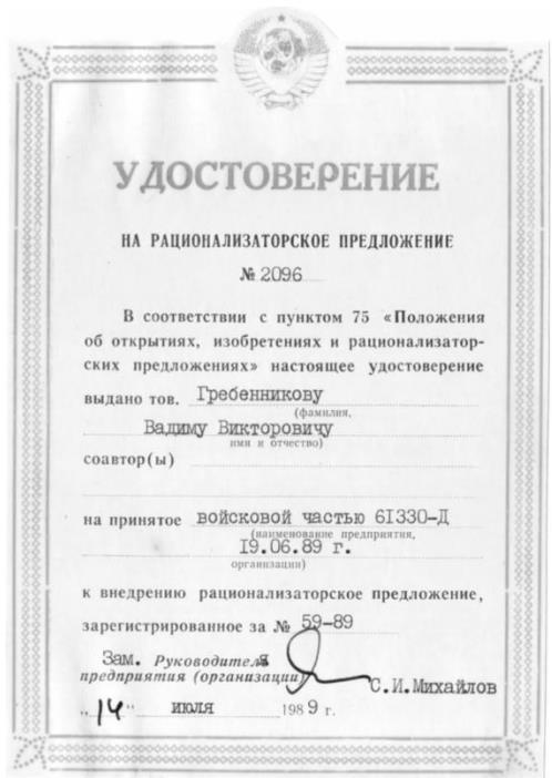 Увидев возможность технического совершенствования имеющегося оборудования, я стал активным рационализатором и за весь период службы смог получить 14 свидетельств на рационализаторское предложение.
