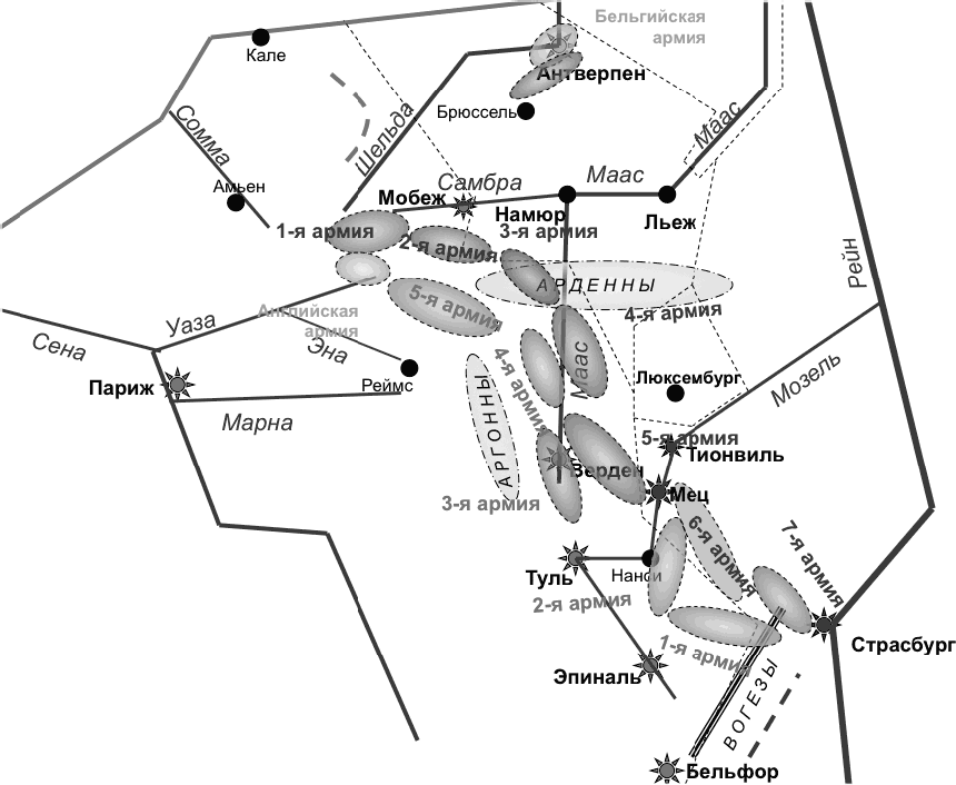Итак, немцы не смогли добиться той выгодной конфигурации, о которой мы говорили в начале главы. Самодеятельность Рупрехта и Вильгельма привела к несколько иной оперативной геометрии. Она, конечно, тоже ничего хорошего союзникам не сулила, но какие-то шансы, скорее теоретические, оставляла…