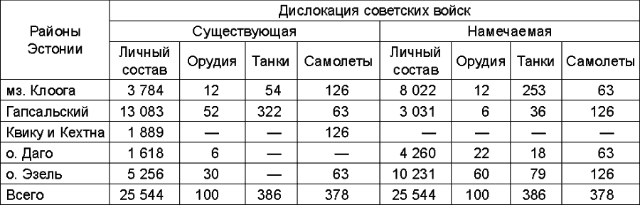 16 апреля нарком обороны направил в Политбюро ЦК ВКП(б) и СНК СССР докладную записку, в которой указал, что «существующую дислокацию наших наземных и воздушных частей в Эстонии нахожу целесообразным изменить в сторону усиления островов Даго [Хийумаа], Эзель [Сааремаа] и района порт Балтийский [Палдиски]». По мнению наркома обороны, «прочное удержание вместе с Военно-Морским Флотом островов Даго, Эзель, порта Балтийский и прилегающих к нему островов Пакри и Оденсгольм, является для нас основной задачей – обороны подступов к Финскому заливу и ко всему побережью Эстонии. Имея же главные силы, как сейчас, в районе Гапсаль [Хаапсалу], мы не сможем обеспечить наземными войсками быструю помощь нашим частям, расположенным на островах и в районе порта Балтийский». Маршал К.Е. Ворошилов предлагал новую дислокацию войск (см. таблицу 12) и представил график ежегодной замены частей в Прибалтике[540]. В тот же день заместитель наркома обороны командарм 1-го ранга Г.И. Кулик и нарком ВМФ флагман флота 2-го ранга Н.Г. Кузнецов направили в Политбюро ЦК ВКП(б) и СНК СССР «проект постановления по дислокации» и решения «других вопросов, связанных с требованием наших вооруженных сил на территории Эстонии» и список отводимых земельных участков общей площадью 29 157 га (из них 13 352 для НКВМФ)[541].