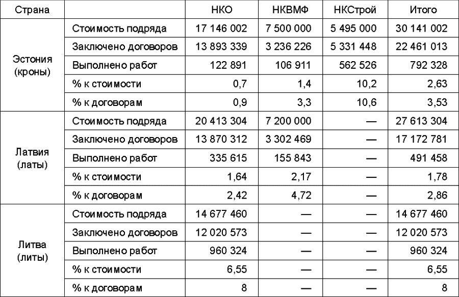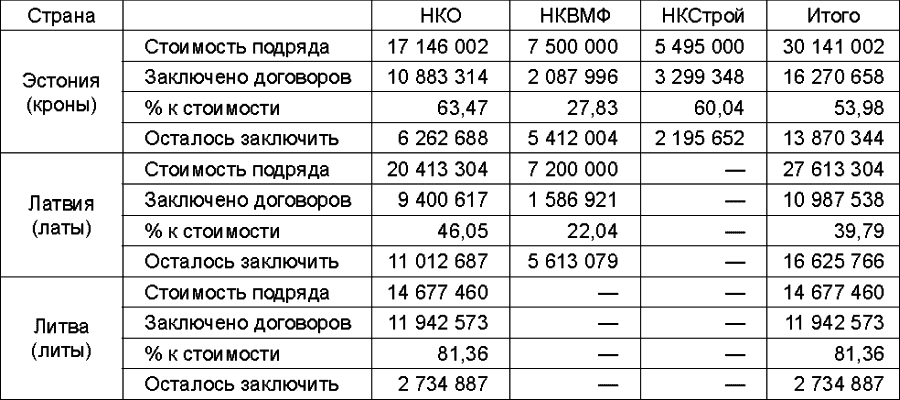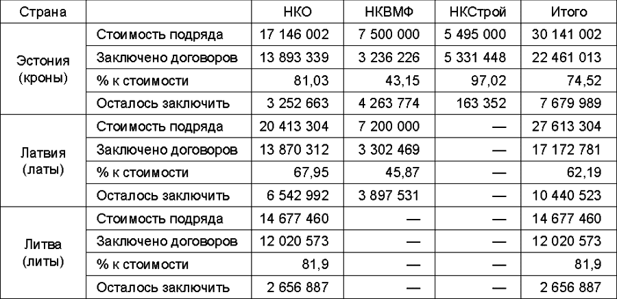 Тем не менее, советской стороне удалось заключить целый ряд договоров на строительство на приемлемых для себя условиях. Так, в Эстонии представители НКО заключили договоры 6 мая, 1 и 8 июня на общую сумму 10 883 314 крон. Представители НКВМФ заключили договоры 18 марта, 13, 16, 20, 22 апреля, 6, 23 мая, 1 и 8 июня на общую сумму в 2 087 996 крон, а представители НКСтроя – 6, 11, 18, 30 марта, 15, 19, 22, 30 апреля, 24, 30 мая и 10 июня на общую сумму в 3 299 348 крон. В целом это составляло 53,98 % от общей стоимости подряда. В Латвии представители НКО заключили договоры 14 и 31 мая на общую сумму в 9 400 617 латов, а представители НКВМФ заключили договоры 6, 11, 17 и 24 мая на общую сумму в 1 586 921 латов. В целом это составляло 39,79 % от общей стоимости подряда. В Литве представители НКО заключили договоры 26, 28 апреля, 7, 15 мая, 5 и 13 июня на общую сумму в 11 942 573 литов, что составляло 81,36 % от стоимости подряда (см. таблицу 13)[555].