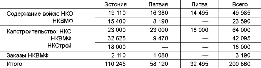 14 марта нарком финансов СССР представил в Комитет обороны более обстоятельную докладную записку № 4-58/2сс «О расходах в Эстонии, Латвии и Литве» с подробными конкретными предложениями. Как указывалось в записке, расходы по заявкам НКО, НКВМФ и НКСтроя на 1940 г. составляют 200 860 тыс. руб. (см. таблицу 16). Кроме того, по оценкам НКВТ, в 1940 г. в Прибалтике расходы по импорту составят 97,6 млн руб., по транзиту – 1,3 млн руб., по фрахту судов – 11 млн руб., по закупкам для Особторга – 6 650 тыс. руб., а на содержание торгпредств и полпредств – 2 млн руб. Итого валютные расходы выразятся в сумме около 320 млн руб., доход же по этим странам составит около 190,1 млн руб., что даст пассивное сальдо в 130 млн руб.