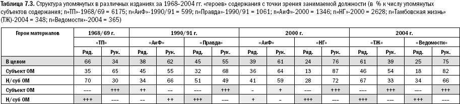 Как видим, институт внештатных авторов «приподнят» в общественной структуре, и это дает ему больший обзор социальной реальности. Формально говоря, группы, составляющие продолжение редакции в тех или иных сферах городской жизни, способны аккумулировать больше информации в связи с более высоким уровнем социальной активности. Предположение проверяется, но, помимо этого, стоит параллельно прояснить и проблему стабильности обнаруживаемых явлений. С этой целью мы выделим из всего поля мнений мнения, которые выражаются не авторами, а только «героями» текста. Поскольку характеристики текста позволяют выявить род занятий, статус и пол субъекта деятельности – «героя» информации достаточно четко, а оценка реальности, мнение, предложение также легко фиксируются лексически, мы сравнили структуры всех упомянутых в разных газетах лиц с точки зрения двух признаков: являются ли они, с одной стороны, «героями» в целом, «героями», высказывающими оценки, мнения, предложения и не высказывающими таковых, а с другой – выполняющими управленческие функции и не выполняющими их (руководителями и рядовыми). Вот что получилось (табл. 7.3).