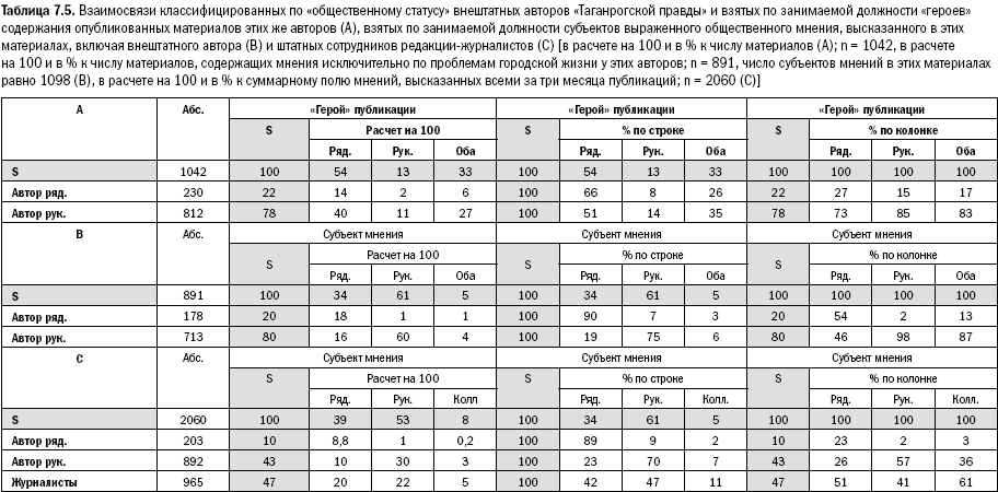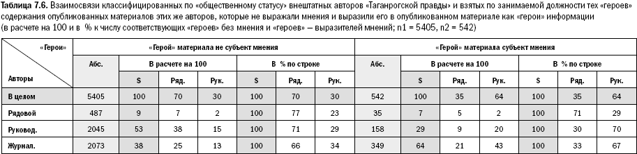Теперь мы видим, что внештатники, выполняющие руководящие и пропагандистско-идеологические функции (54 % + 11 % + 8 %) в масштабах города и отдельных предприятий и учреждений дают более трех четвертей публикаций, выражающих мнения и оценки состоянию дел городской жизни. Если взять общее поле упоминаний субъектов деятельности – «героев» публикаций (табл. 7.6), то «авторами-руководителями» дается почти вшестеро большая доля упоминаний «героев». И при этом в 72 % от этих упоминаний руководящие авторы пишут о рядовых «героях». Рядовые же авторы описывают «героические деяния» руководящих субъектов деятельности почти в 20 раз (!!!) меньшей долей упоминаний (2 %).