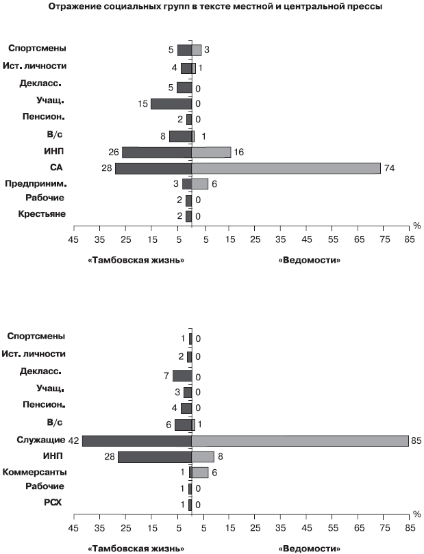 В принципе можно было бы подробно проанализировать результаты прямого потребления информации за 40 лет из газет, радио и телепередач. Однако это требует совершенно отдельной и глубоко фундированной в методическом плане книги, где можно показать, как работают индикаторы эффективности информационного приема: группы по активности приема сообщений, группы по степени осознания информационных потребностей; интенсивность приема – характеристик сообщений, номиналий, социальных элементов содержания, рекламных объектов и их элементов, наконец, сложных, сконструированных на основании выделенной общественной семантики объектов. Частично эта проблема будет затронута ниже, а пока что приведем две диаграммы освещения социальной структуры и выражения мнений в газетах «Тамбовская жизнь» и «Ведомости» в 2004 г.