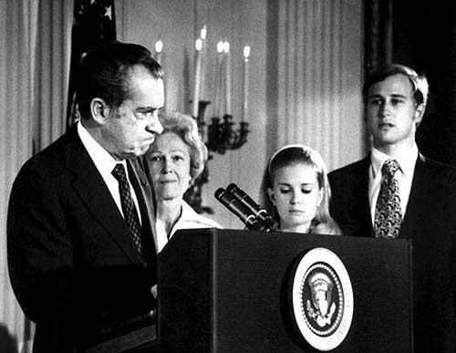 Травля Никсона длилась семнадцать месяцев по нарастающей. Он метался, пытался подкупить общество самыми впечатляющими акциями. 18 марта 1973 г. из Вьетнама вывезли последнего американского солдата. Но триумфа не получилось. Все говорили только об «Уотергейте». В январе 1973 г. были арестованы и предстали перед следователями взломщики в «Уотергейте». С марта 1973 г. стала работать сенатская комиссия по Уотергейтскому делу, заседания которой показывались по телевидению в прямой трансляции. Параллельно всплыло дело о «водопроводчиках» – так прозвали работников администрации Никсона, которые занимались установкой подслушивающих устройств в кабинетах его политических противников. За прослушки посадили в тюрьму нескольких близких к президенту людей.
