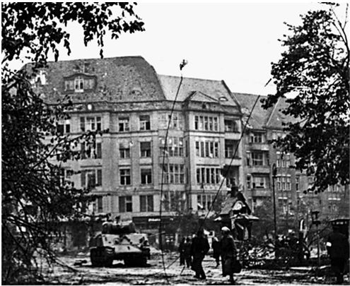 Подбитый танк «Шерман» на берлинской улице. Скорее всего танк принадлежал 1-му механизированному корпусу