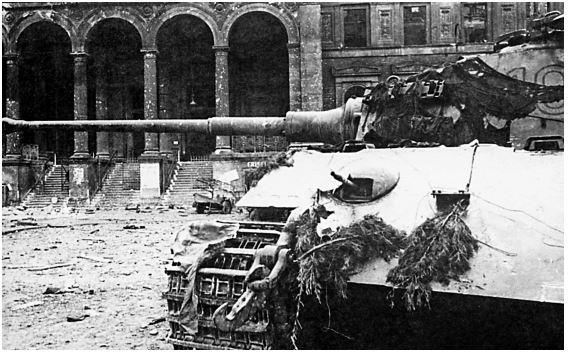 Брошенный у Потсдамского вокзала «Королевский тигр». Он принадлежал либо дивизии «Мюнхеберг», либо 503-му батальону тяжелых танков СС