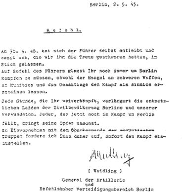 Жирную точку в борьбе за город поставил его комендант Гельмут Вейдлинг. Он с самого начала был настроен пессимистически относительно перспектив обороны Берлина имеющимися силами. 1 мая вернувшийся с переговоров Кребс сообщил Вейдлингу, что советское командование требует безоговорочной капитуляции гарнизона. К тому же к вечеру 1 мая частям 8-й гв. армии оставалось пройти до Рейхсканцелярии всего несколько кварталов.