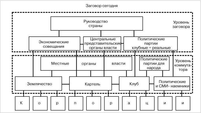 Корпоративная система — это не есть заговор. Но заговора нет вне корпоративной системы. Каждая корпорация в общем сама по себе. Заговор возникает, когда несколько корпораций объединяются с целью захвата или удержания центральной власти. Субъектами заговора являются корпорации. И хотя говорится, например, «партия Черномырдина» — этот Черномырдин просто метка корпоративного союза, его можно убрать или поставить в любое время, и ничего не изменится. Корпорации есть на всех этажах общества, и заговор-структура распространяется на все этажи. Область, город, район — для захвата этих подразделений нужно также объединяться, и личностям в этих объединениях места нет.
