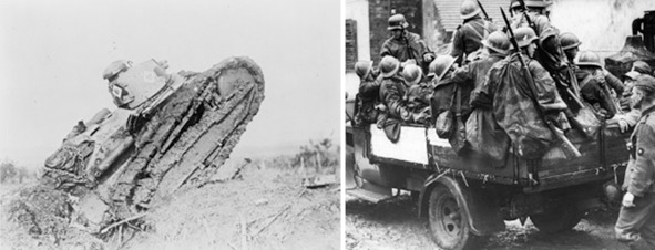 1. Французский танк FT-17 преодолевает траншею 2. Пленные французские солдаты садятся в кузов грузовика в городе Саарбрюккен