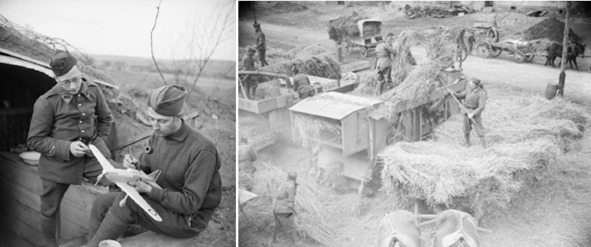 1. Артиллеристы 402-го полка клеят самолетики 2. Солдаты 4-й французской армии принимают участие в сборе урожая осенью в 1939 г.