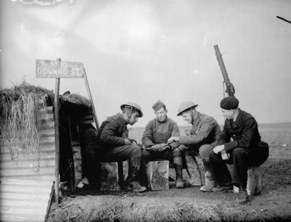 Солдаты британского экспедиционного корпуса и французских ВВС на линии фронта. Надпись над блиндажом «10 Downing Street» – адрес резиденции британского премьер-министра. Фотография сделана 28 ноября 1939 г.