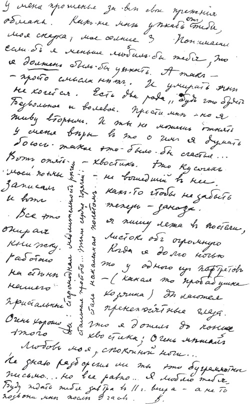 Не знаю, разберешь ли ты это безграмотное письмо… Но все равно… Я люблю тебя. Буду ждать тебя завтра в 11 ч. вечера – а не то позвони мне после 9 часов. В.