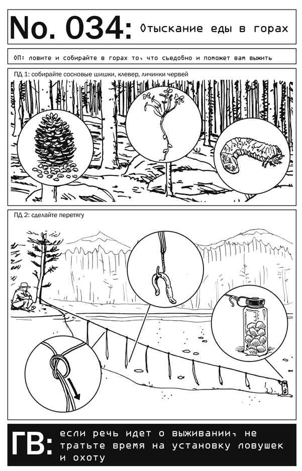 При подготовке к походу, внимательно изучая карту местности, по которой будет проходить ваш маршрут, выясните, какие съедобные растения и насекомые там обитают. Доступными и безопасными источниками жиров, питательных веществ и белков являются сосновые шишки, клевер, а также личинки и дождевые черви. Выбирайте сухие сосновые шишки, у которых чешуйки уже открылись, и разбивайте их об землю, чтобы высвободить имеющиеся в них орешки. Среди клеверов съедобны и безвредны все. Можно воспользоваться одним правилом: любое растение, которое, как вы видите, едят животные, наверняка будет безопасно и для человека.