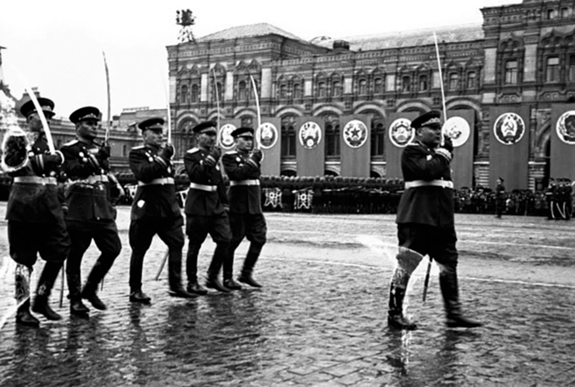 Парад Победы в Москве. Колонна 2-го Украинского фронта. Возглавляет колонну командующий войсками фронта Маршал Советского Союза Р. Я. Малиновский. В строю второй слева – командующий 6-й гвардейской танковой армией Герой Советского Союза гвардии генерал-полковник танковых войск А. Г. Кравченко
