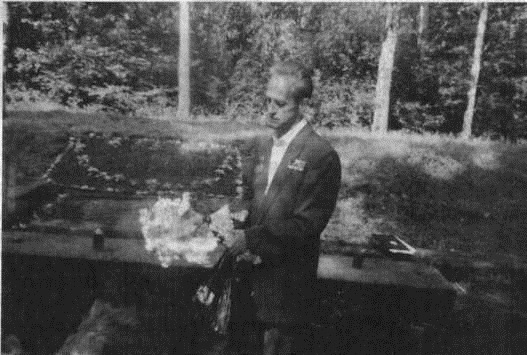 «Володя! Ты маленький, юркий. Беги, спасайся», — просила его мать. Володя прыгнул, как кошка, в картофельную ботву. Он единственный, кто спасся в дни расстрела. На снимке: Владимир Иосифович Хизвер у захоронения в Вязовеньке — очередное свидание с матерью.