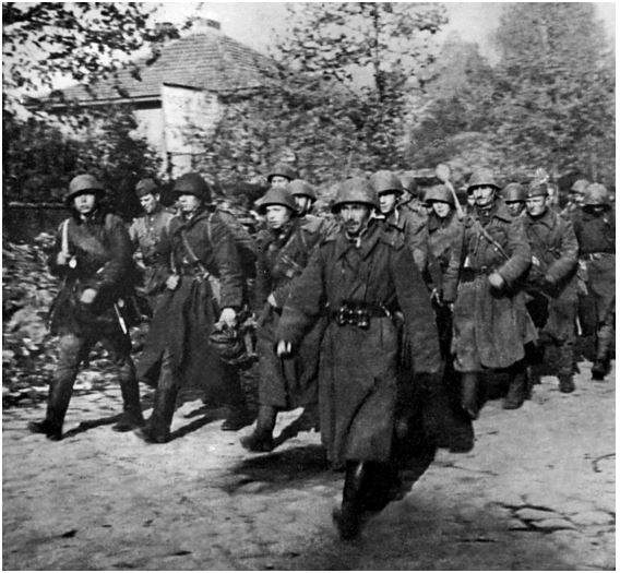 Советская пехота на марше. У одного из бойцов виден фаустпатрон на плече