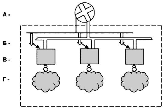 Рис. 10. Схема организации эксплуатации наемного труда теневым менеджментом. А — «хозяин»; Б — «контролер»; В — «надсмотрщики»; Г — «наемные работники».