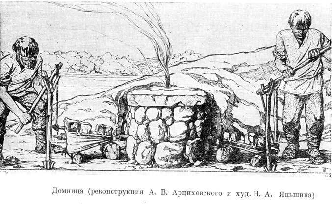 Дальше события развивались так. Строили из камня и глины полую коническую башню с открытым верхом внизу вставлялись специальные глиняные сопла, к которым присоединялись кожаные меха. Делалось небольшое поддувало. Все, домница готова.