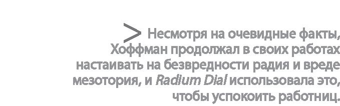 «В свете широкого распространения данных отчетов об отравлении [радием]… пришло время обратить внимание на один важный факт, который пока что упоминался в новостях лишь мимолетом… Все пугающие случаи так называемого «отравления радием» на востоке, о которых сообщалось в прессе, имели место в организации, использовавшей светящуюся краску, изготовленную из мезотория… В Radium Dial [используется] исключительно чистый радий».