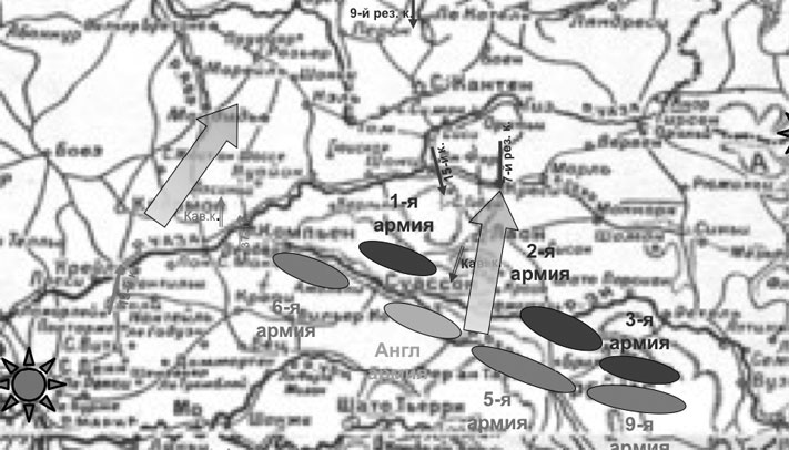Клюк отдал противнику берег Эны, развернув армию на высотах к северу от реки и кое-как прикрыв фланги оставшейся кавалерией. Нужно иметь в виду, что три кавалерийские дивизии на левом фланге – гвардейская, 2-я и 9-я – вынесли на себе всю тяжесть боев в «марнской бреши» и были практически небоеспособны.