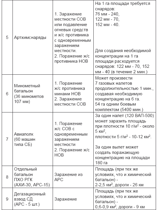 При планировании любой наступательной армейской операции в те годы предполагалось исходить из расчета: химические батальоны — по одному на стрелковый корпус, минометные батальоны — тоже по одному на стрелковый корпус, химизированные авиаполки — по одному на авиадивизию, огнеметные батальоны — по одному на каждую танковую дивизию или бригаду. На день боя планировалось использовать: 0,5 зарядки ОВ для наземных средств, 3–4 зарядки ОВ для авиации, 1–2 боекомплекта авиахимбомб, артхимснарядов и химических мин, 50–60 тыс. ЯД-шашек [137].