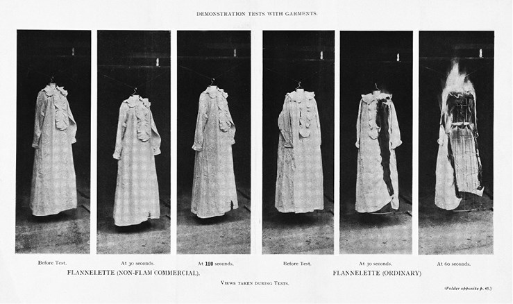 1. Ночная сорочка из негорючей байки Перкина, показанная слева, лишь слегка подпалилась в области подола на второй минуте эксперимента, в то время как обычная байка сгорела почти полностью всего за 60 секунд. Развернутая страница из буклета: Fire Tests with Textiles: The Committee’s Report, British Fire Prevention Committee. 1910. Библиотека Веллкома, Лондон
