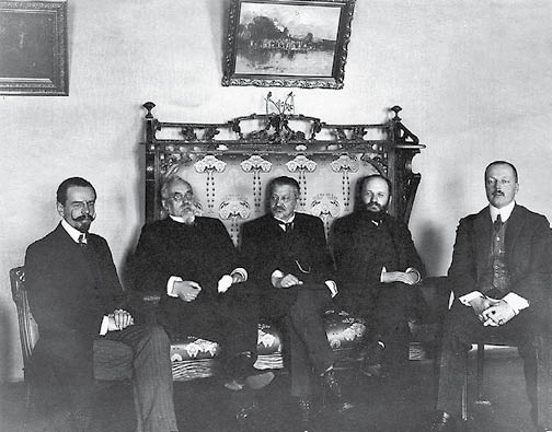 Группа депутатов Первой Государственной думы (слева направо): Ф.Ф. Кокошкин, С.A. Муромцев, И.И. Петрункевич, М.М. Винавер, В.Д. Набоков (отец писателя Набокова)