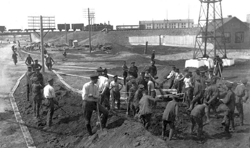 Строительство трамвайной линии в Калинине, 1934 год. Слева виден путепровод Октябрьской железной дороги, за которым начинается проспект Калинина.